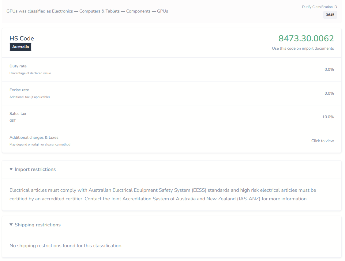 We’ve updated the HS Lookup result page to makes the duties, additional taxes and compliance messaging easier to comprehend. You’ll now see: