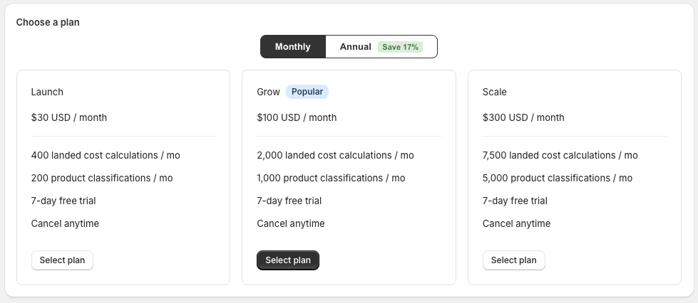 Select a plan that suits your international order volume, there is more information on billing and usage here: