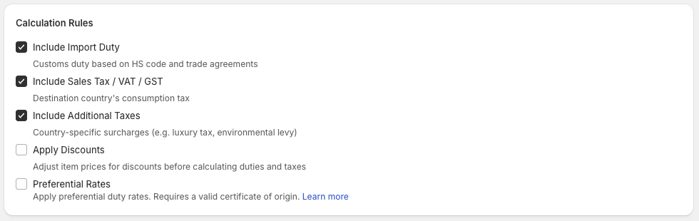 - Preferential Rates - when enabled the calculation will take Free-Trade Agreements into account, note that to qualify for preferential treatment your carrier will require a valid CO. We recommend leaving this disabled.