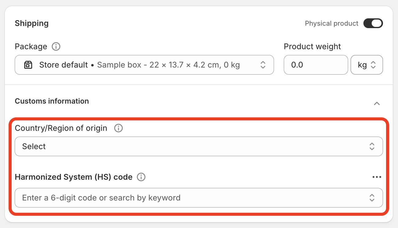 You can also use a CSV file to update your products if you need to make bulk updates and already have your HS codes and countries of origin on hand. Shopify provides full instructions on how to do that here.