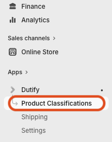 - In Shopify admin, click the Dutify app and go to Product Classifications: