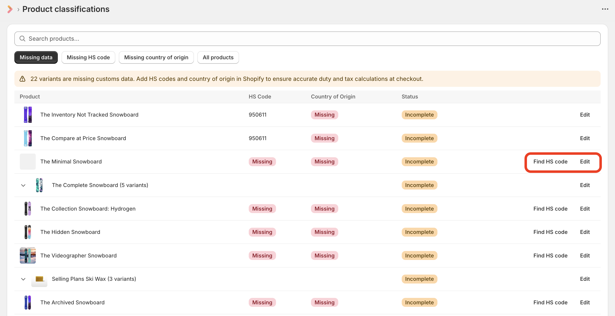 You can click Find HS Code to automatically find the HS code for the product or variant. Or you can click Edit, which will take you to directly the product page to fill out the customs information fields manually: