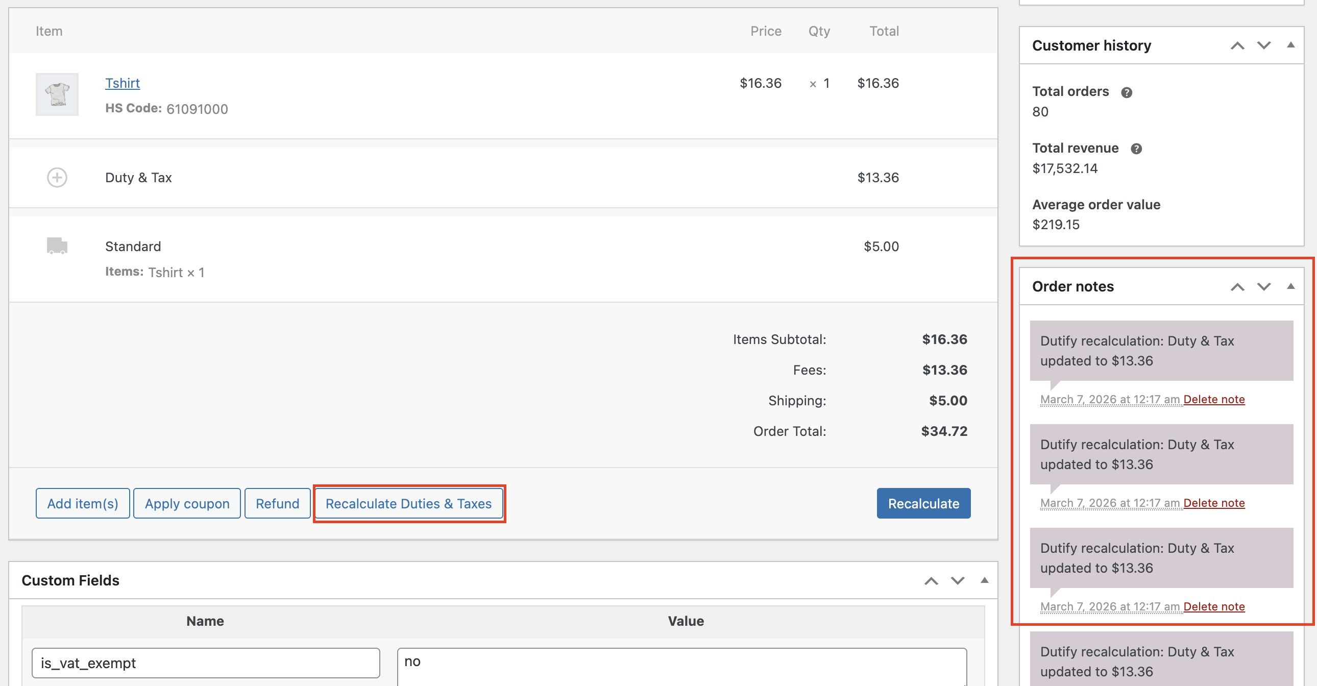 Each time duties are recalculated, a note will be also be added to the Order notes section: